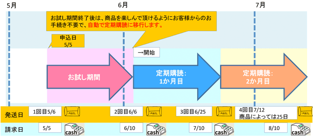 定期購読商品をお申込頂いた場合の発送と請求はお申込日、商品によって異なります。